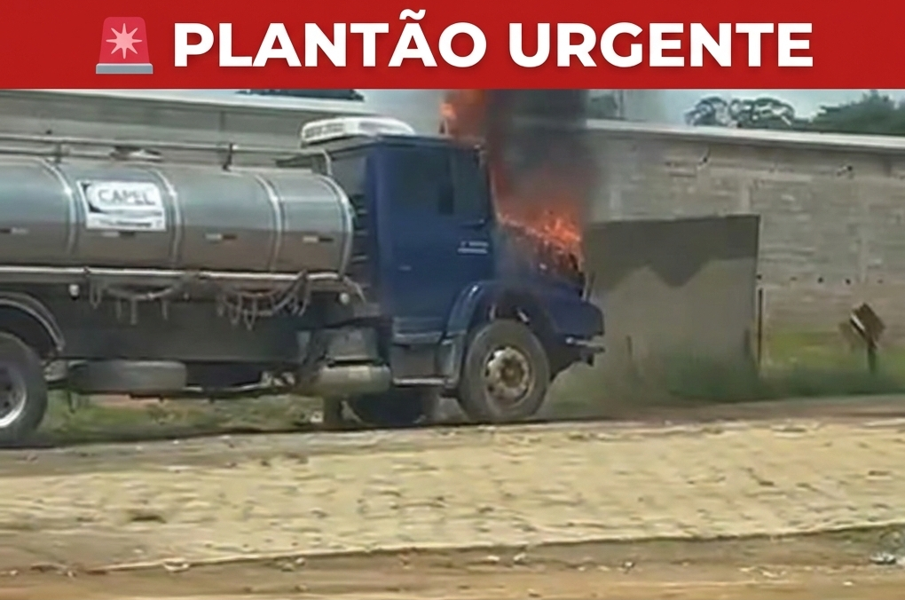 Situação: Imagens mostram chamas intensas na cabine e uma densa coluna de fumaça preta.