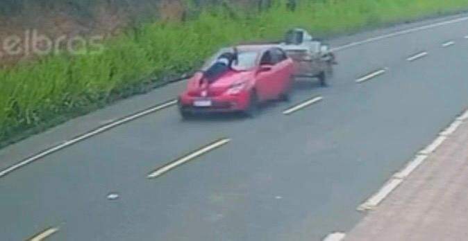 LARANJA DA TERRA (ES) – Um desentendimento entre um casal resultou em uma cena de alto risco na região de divisa entre o Espírito Santo e Minas Gerais. Uma mulher foi flagrada agarrada ao capô de um carro em movimento após uma discussão com o companheiro.
