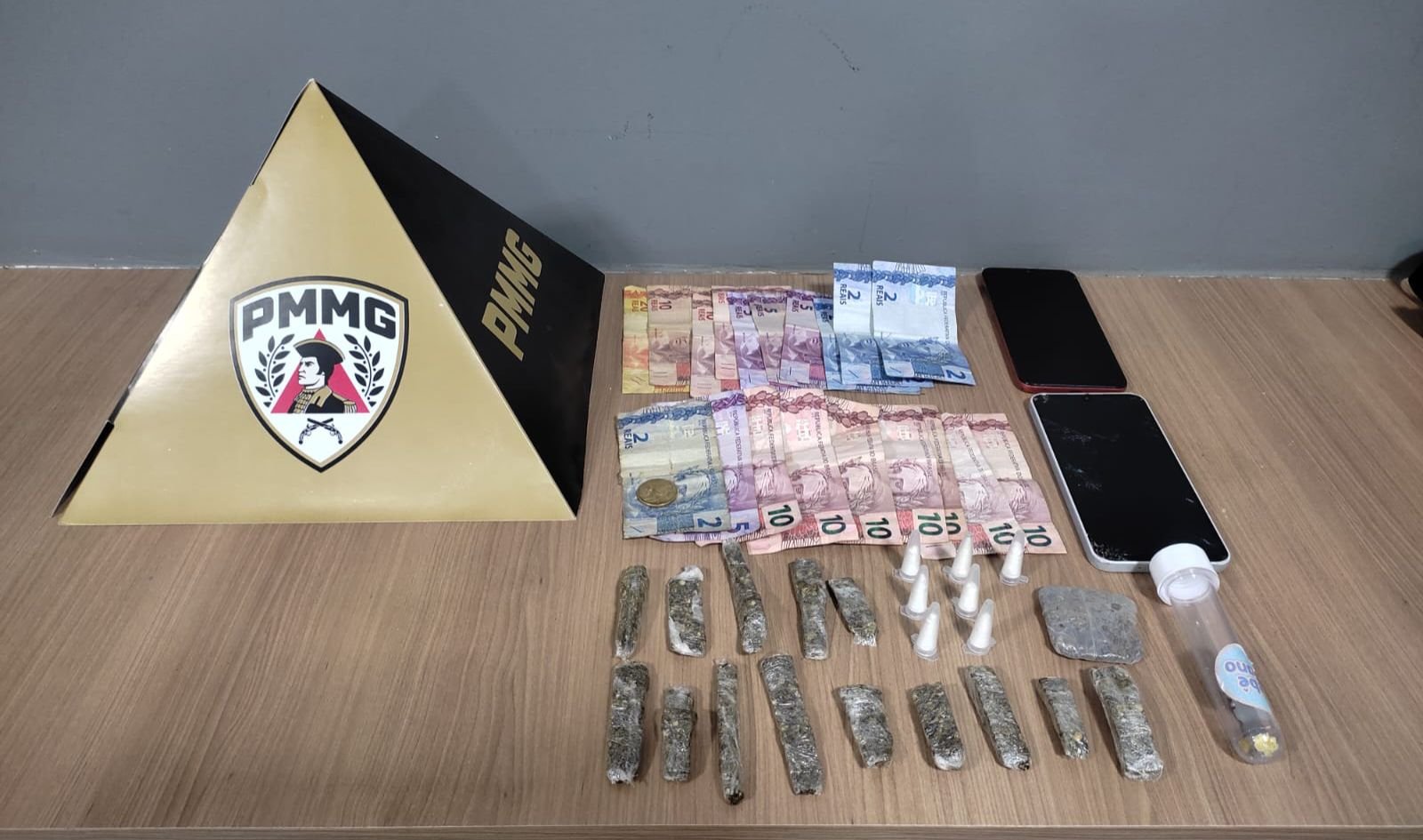 Durante as buscas, foram localizadas e apreendidas 14 buchas de maconha, um tablete de maconha, uma pedra de crack, sete eppendorfs de cocaína, dois aparelhos celulares e a quantia de R$ 150,25.