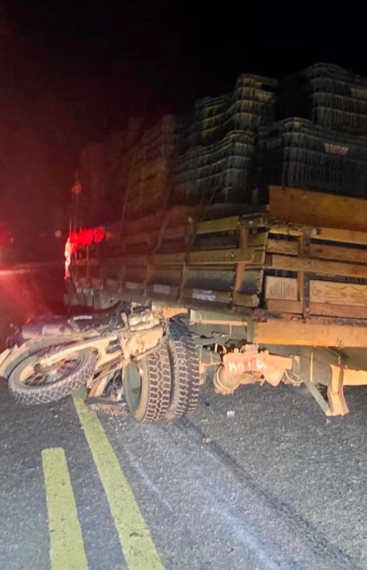 De acordo com o registro da Polícia Militar Rodoviária, o impacto foi severo. A motocicleta ficou presa entre a roda e a carroceria do veículo de carga, resultando na destruição parcial da moto.